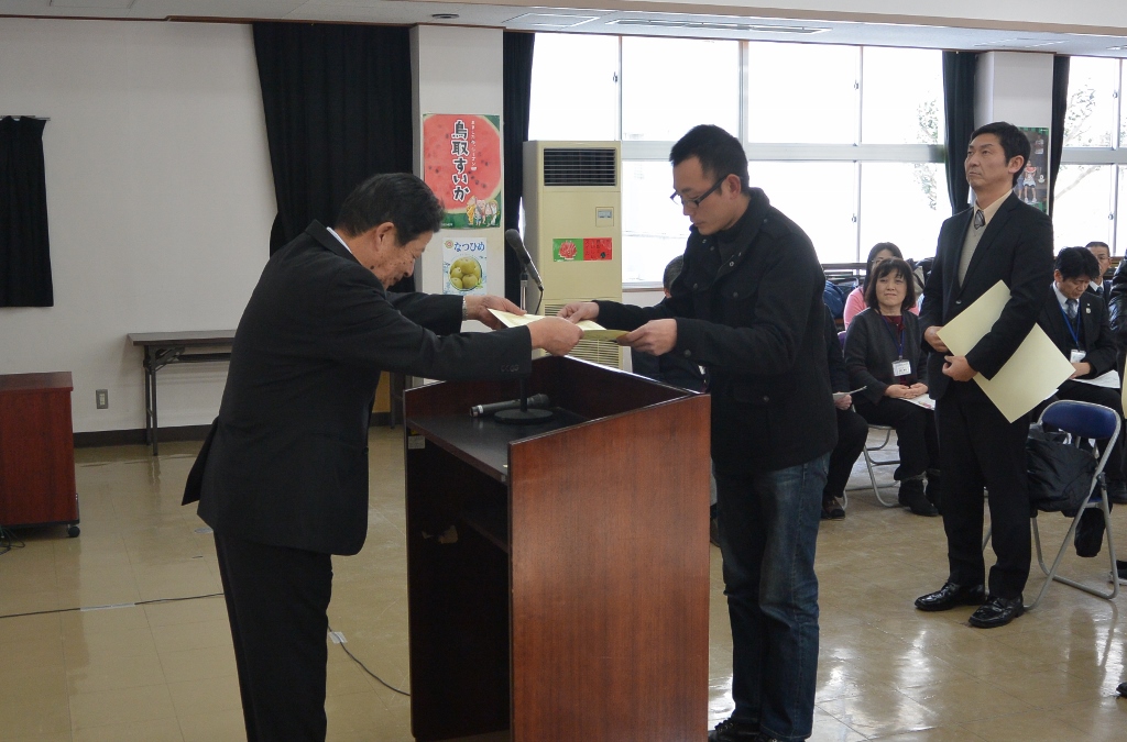修了証書授与(中村友二郎 研修生) 激励の辞(鳥取県農林水産部 米山次長)