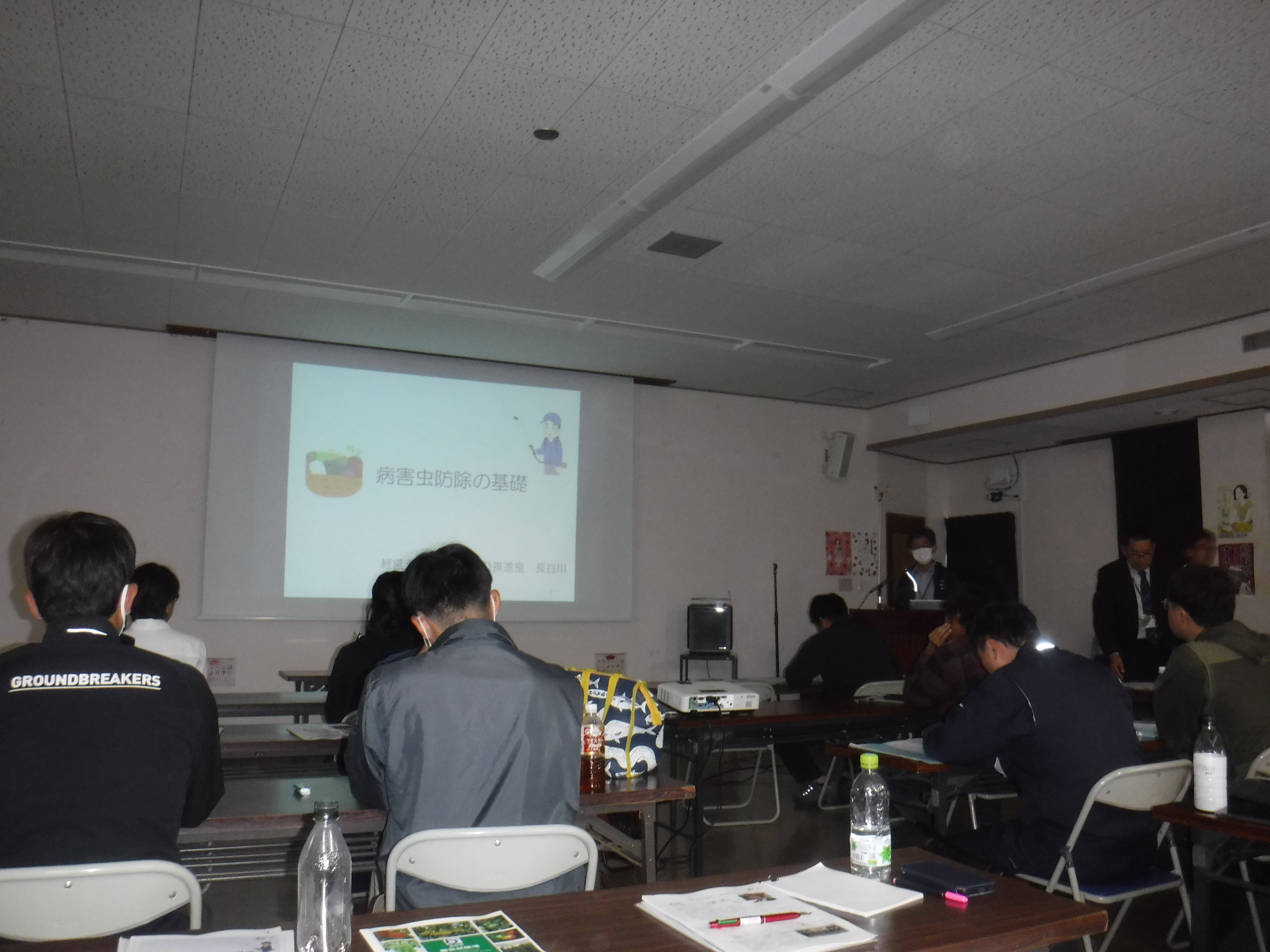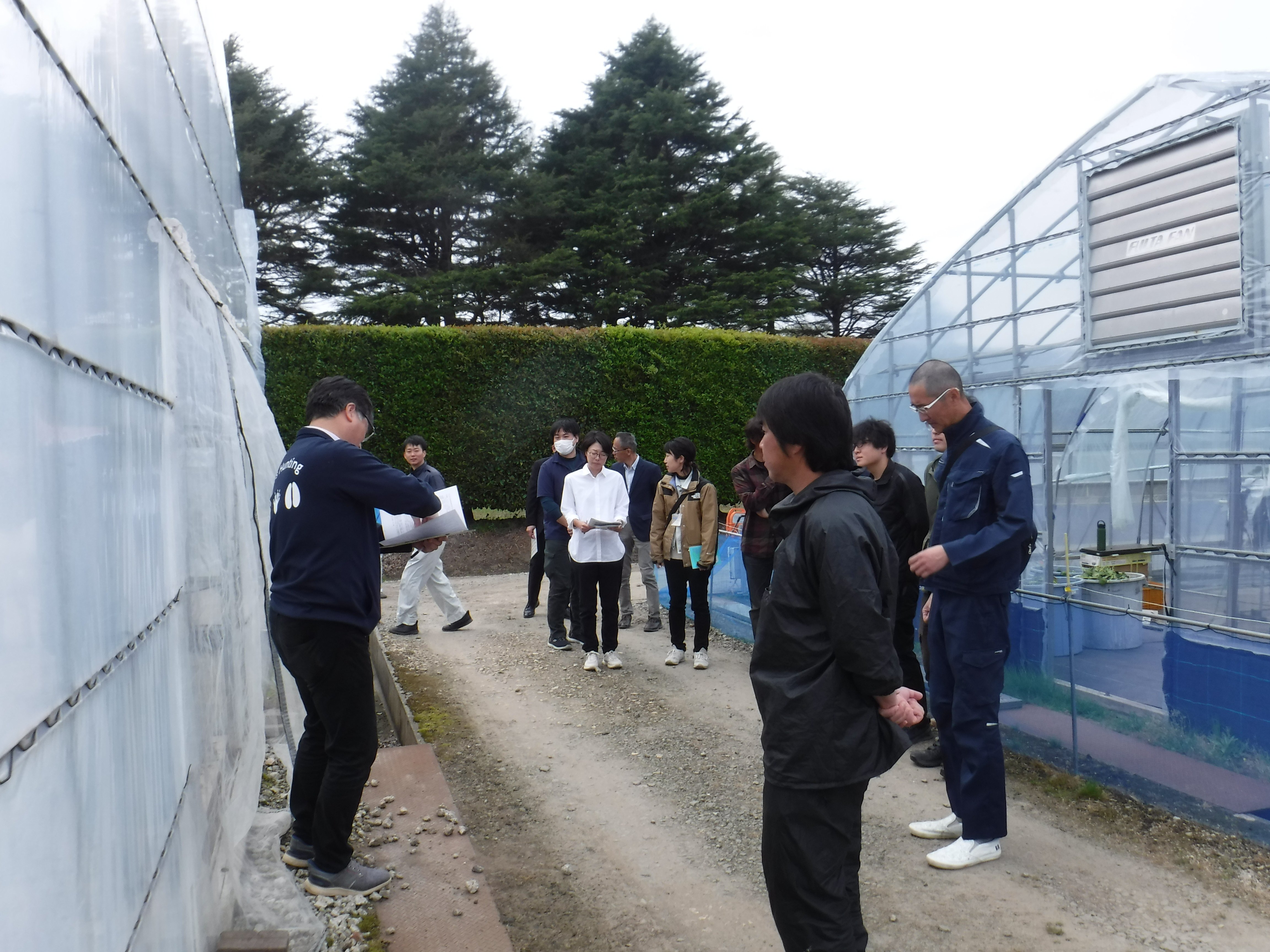 午後は農業大学校の主催で就農準備サポート研修が行われました。園芸試験場を会場として試験場の役割を知り、ナシのジョイント栽培園やスイカハウスを中心とした試験ほ場の取組を視察しました。また、本格研修に当たって農作業と健康・熱中症、病害虫と雑草防除について講義が行われ、農作業の前提になる知識を学びました。さらに先輩農業者から、研修時代の経験、就農にあたって心がけてきた事など、体験談を講演いただき、研修生は就農にむけた意識を高めました。